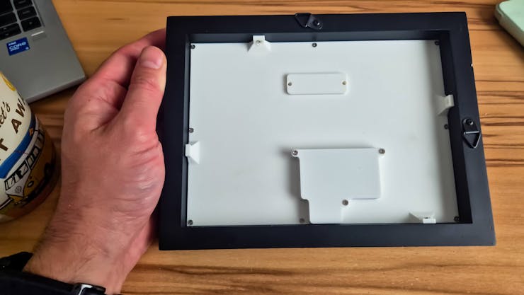 - The back of the framed unit with a custom 3D-printed mount